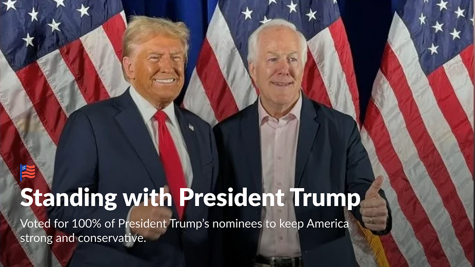Conservative Senator John Cornyn stands shoulder to shoulder with President Trump 99% of the time to finish the wall, crush Biden’s open-border policies, and put America First. As a former judge, Texas Attorney General, and now U.S. Senator, Cornyn has never backed down from a fight for our freedoms. Together with President Trump, he cut taxes, secured the border, defended constitutional judges, and kept Texas strong. Texas comes first, always.